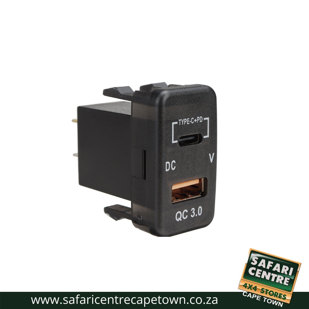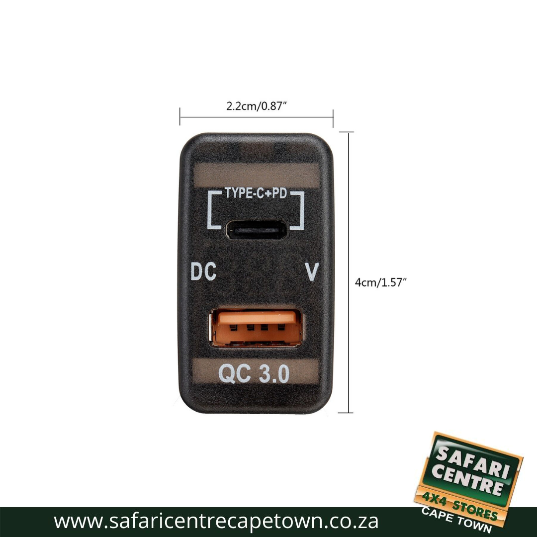 A QC3 USB charger with a volt meter and C-Type port designed specifically for the Toyota Vigo is a charging accessory that enhances the utility and functionality of your vehicle by providing extra charging ports to charge your GPS, phone, tablet, etc.