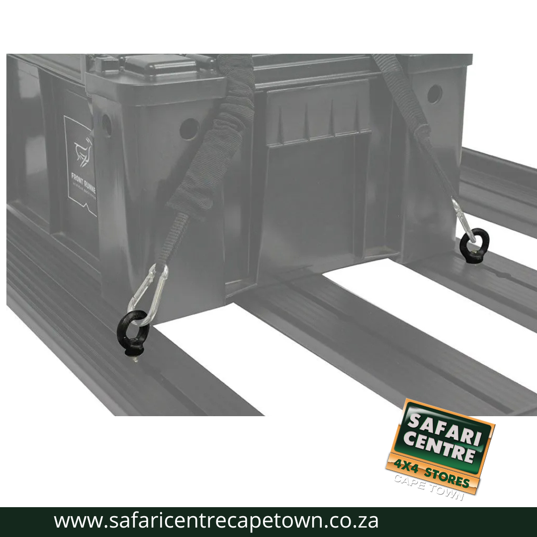 These steel tie down rings can be used to attach just about anything to the top, sides or bottom of your Front Runner Rack. Galvanized steel, powder coated black. Sold in pairs.