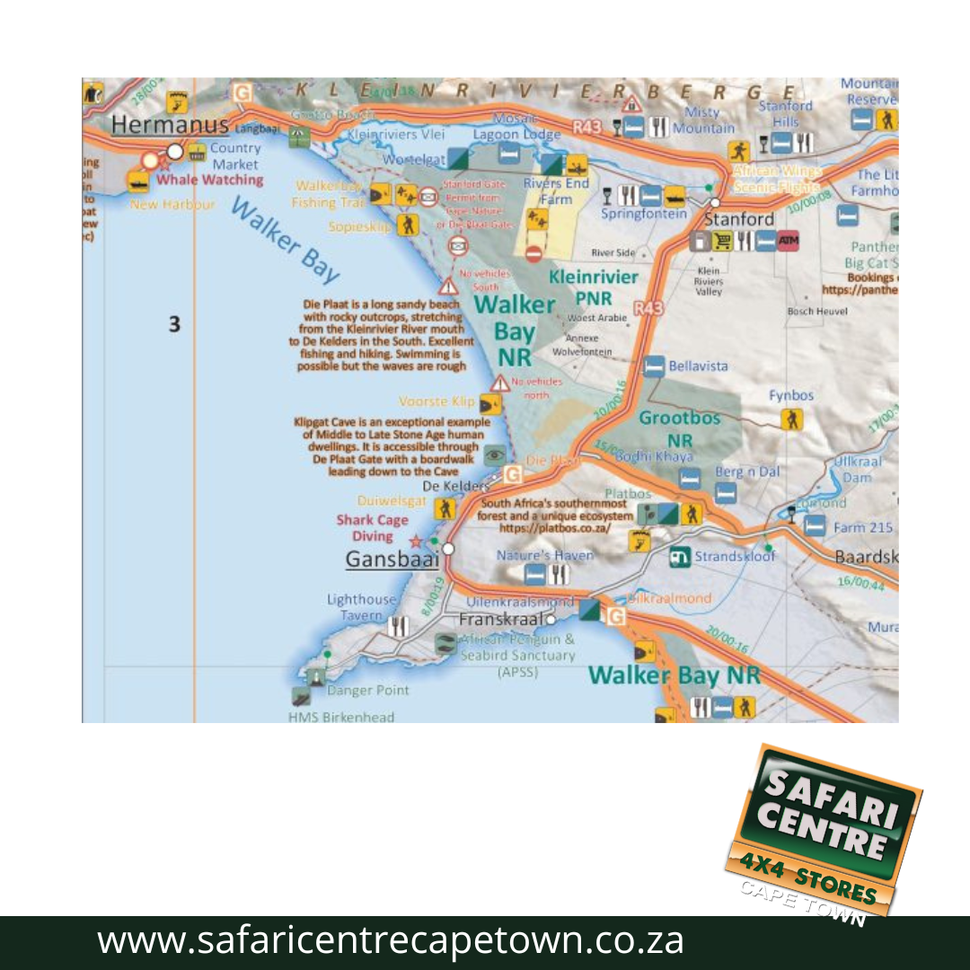 This map is perfect for day trips in and around Cape Town or from the Winelands towns of Stellenbosch, Paarl and Franschhoek. It covers some of the most iconic tourism attractions in the Western Cape which include Cape Point and Table Mountain, Robben Island where Nelson Mandela was held prisoner during the apartheid era, the wine routes of the Cape, the whale watching along the coast of Hermanus and further east, the southernmost point of Africa at L’Agulhas and shark cage diving at Gansbaai.