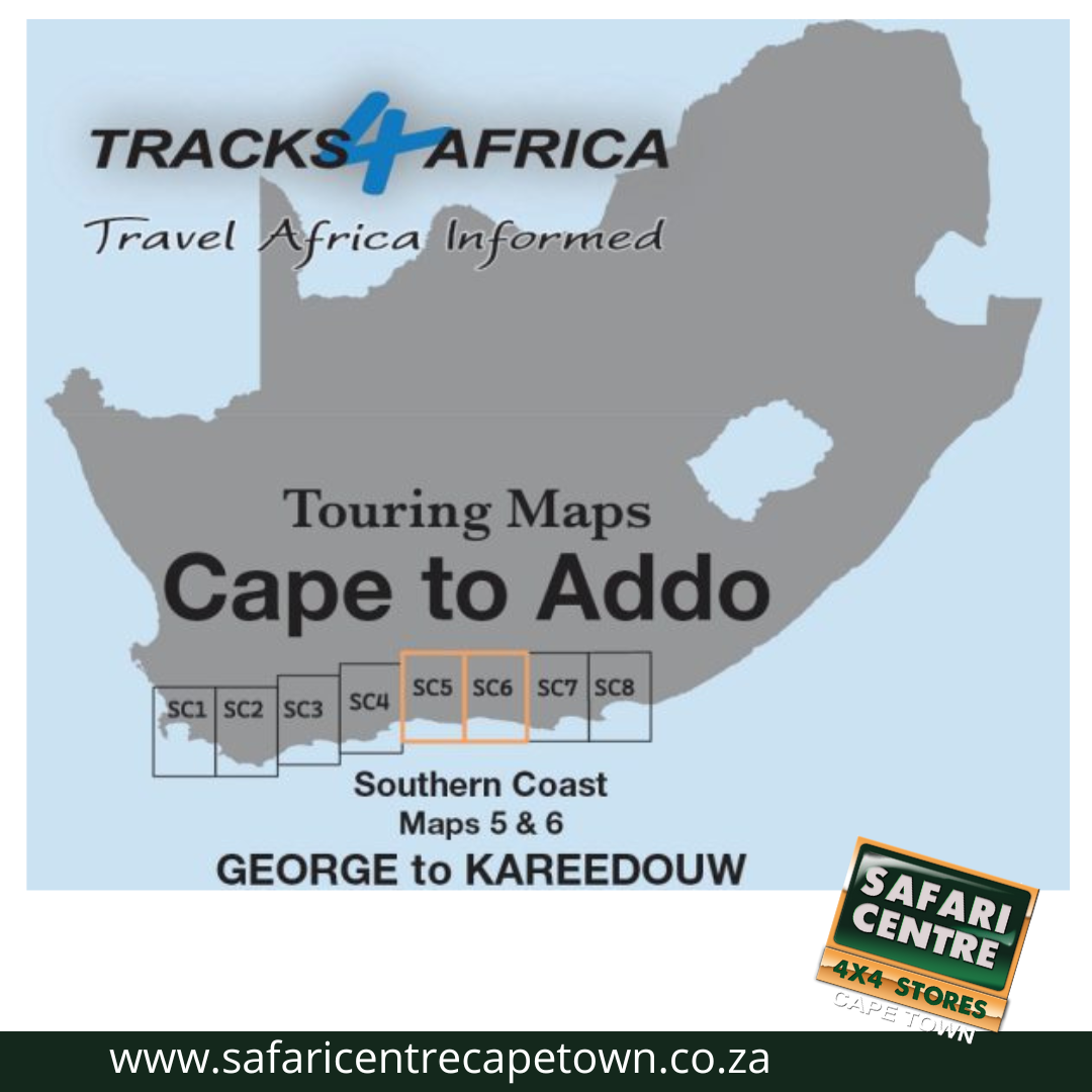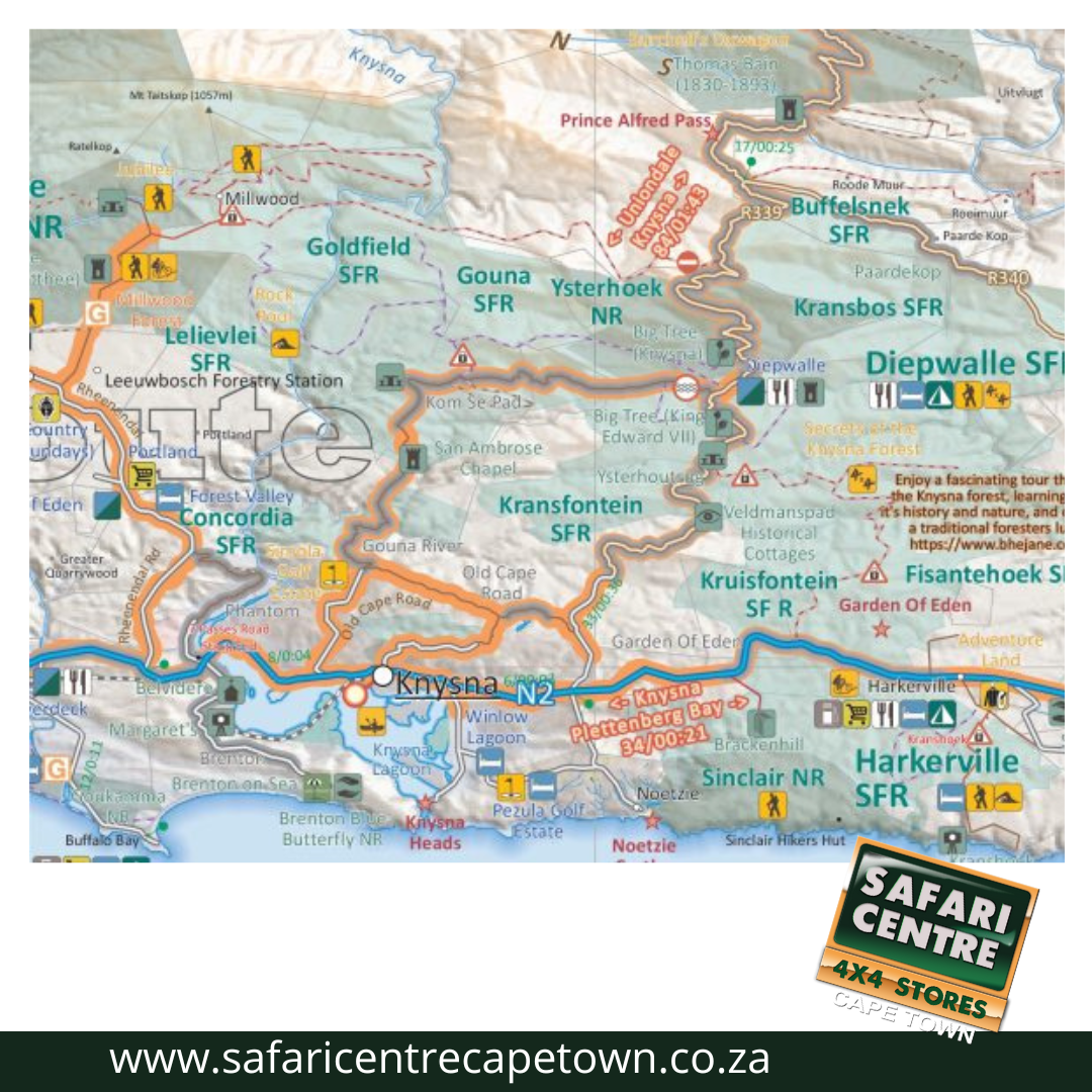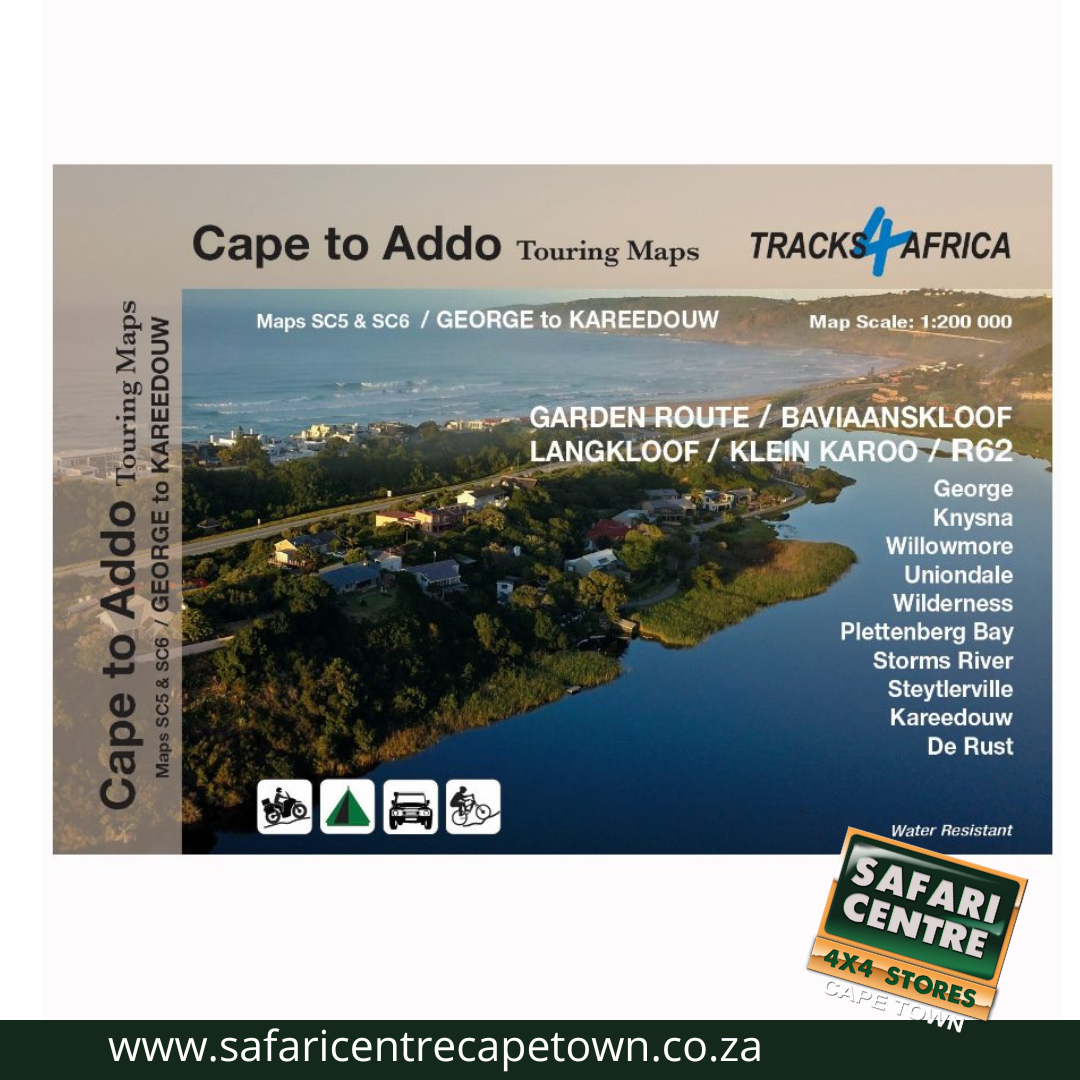 As the name suggests, these two maps, printed on either side of a single sheet of Duraflex paper, stretch from George in the west to Kareedouw in the east. The coastline forms the southern boundary and to the north it includes places like Klaarstroom, Willowmore and Steytlerville which are in the Karoo.